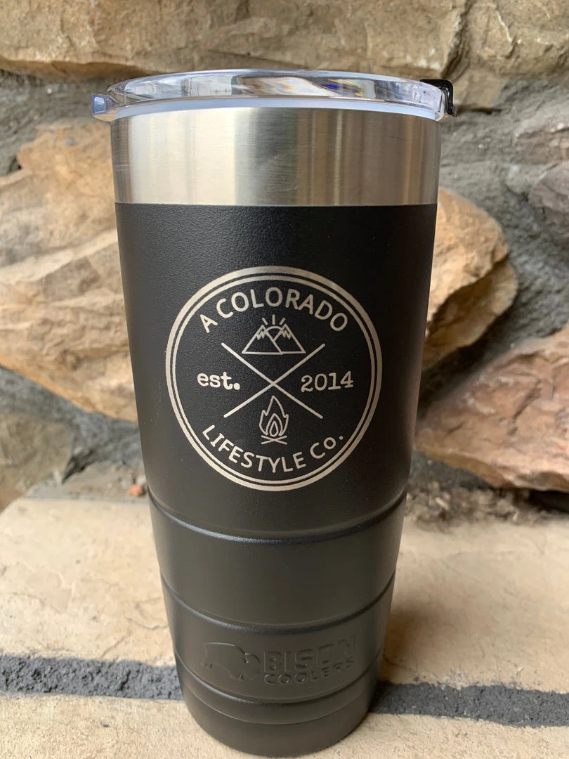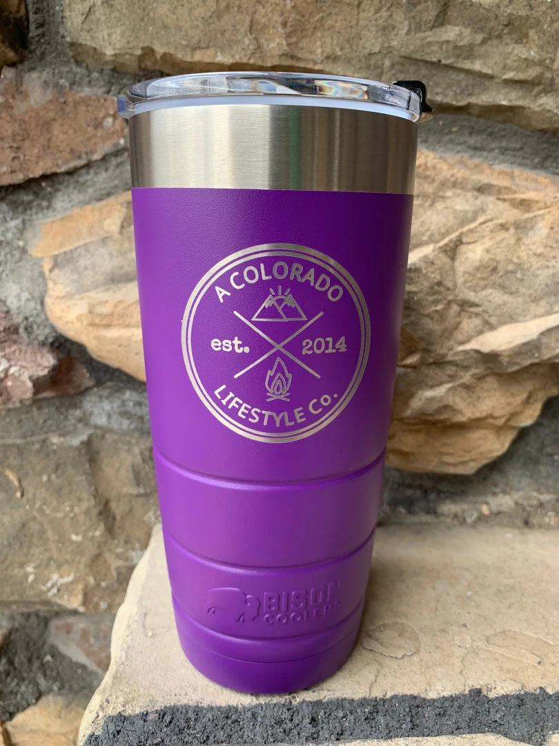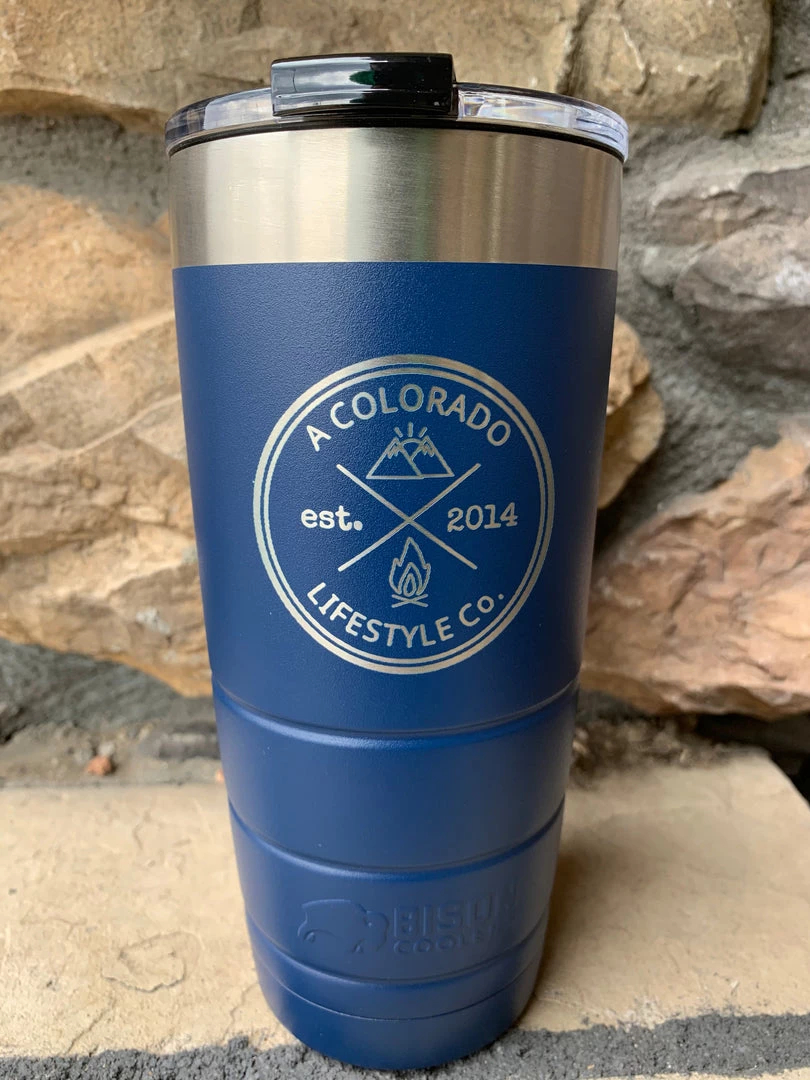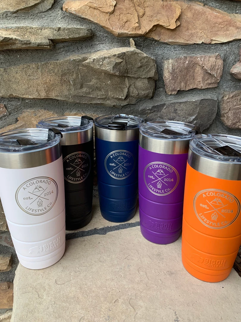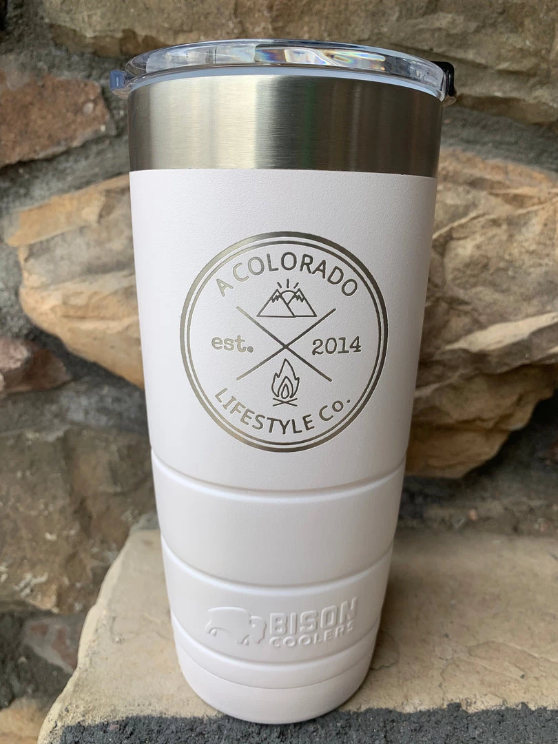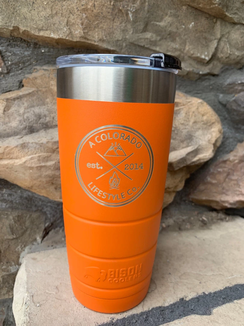 A Colorado Lifestyle Company partnered with Bison Coolers to produce its first set of tumblers. Here we have the 22oz vacuum insulated stainless steel tumbler with a screw on cap. It has a flip locking lid for easy consumption of your favorite beverage. It has been tested and staff approved, it doesn’t leak when properly attached.