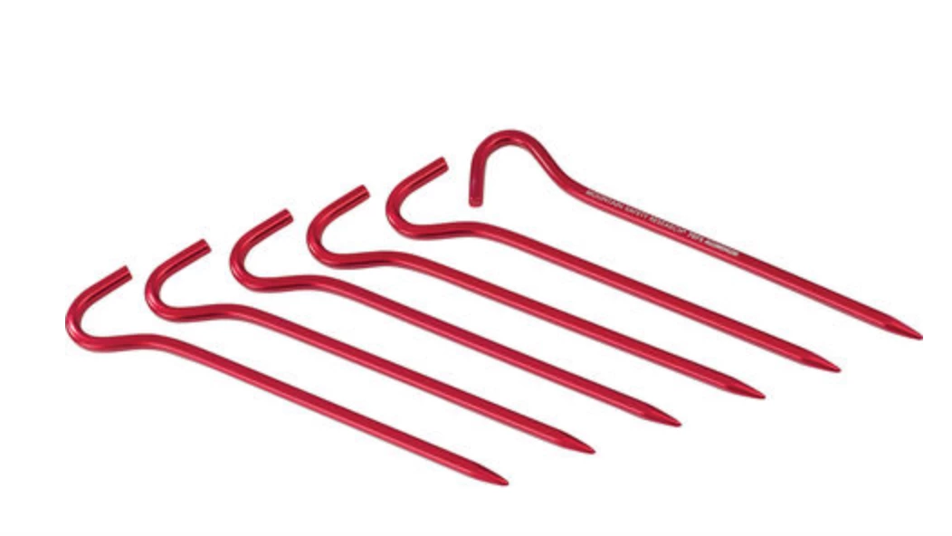 Made of strong, lightweight and corrosion-resistant 7000-series aluminum, the Hook tent stake features a hook on the end that allows for easy removal. Sold as a kit of 6 stakes.