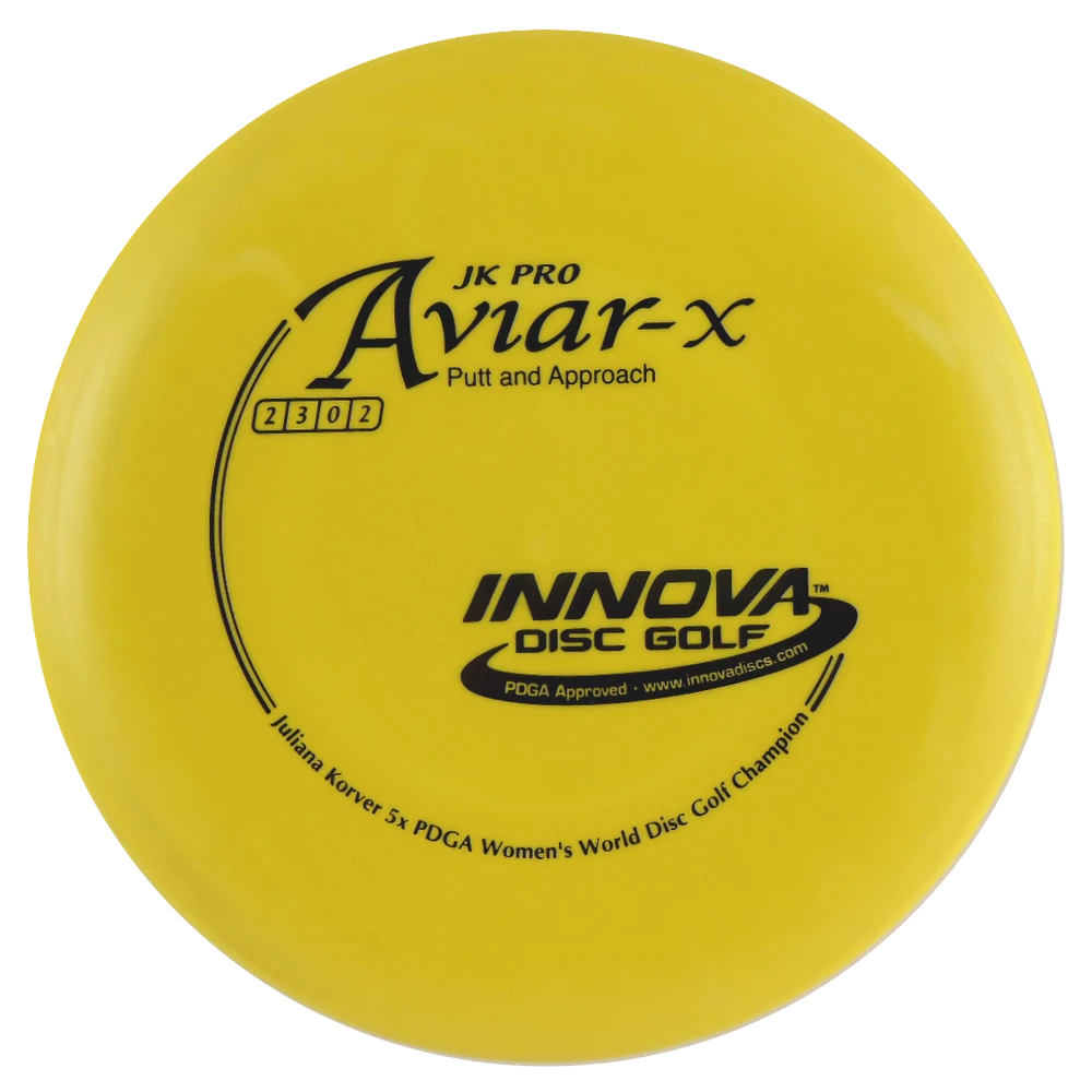 Here is what Innova says about the disc: “The JK (Juliana Korver) Aviar is made from the driver mold in a special blend of durable Pro-line Plastic that is more flexible and grippier than the other Aviar models. It has the same flight characteristics as the KC Aviar. Its softer plastic is better in colder climates and for those who have dry hands and require a tackier grip.”